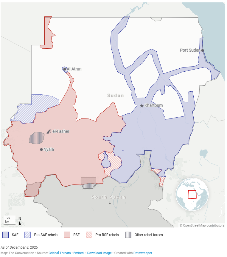 수단의 SAF(수단군, Sudanese Armed Forces)와 RSF(신속지원군, Rapid Support Forces) 통제 지역이다. 수단은 수단군(SAF)과 신속지원군(RSF)으로 분열돼 있으며, 일부 지역은 이들을 지원하는 반군 세력이 장악하고 있다.