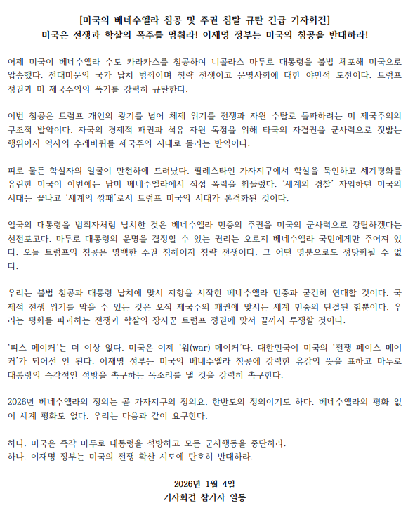 참가자들은 기자회견문을 통해 미국은 모든 군사행동을 중단하고 마두로 대통령을 즉각 석방하라이재명 정부는 미국의 전쟁 확산 시도에 단호히 반대하라고 요구했다.