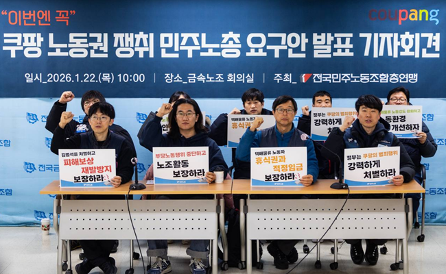 민주노총은 쿠팡 물류·택배·라이더 노동자들이 장시간·고강도 노동과 저임금 구조노조 탄압산재 은폐에 시달리고 있다며 죽지 않고 일할 권리를 보장하라고 요구하고 나섰다민주노총은 22일 기자회견을 열고 쿠팡이 노동자의 생명과 시민의 안전을 외면한 채 성장해 온 구조를 더 이상 용납하지 않겠다”라며 “로켓배송 멈추고 안전배송하자”고 밝혔다.