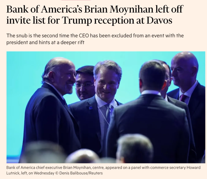 <뱅크오브아메리카의 브라이언 모이니한, 다보스 트럼프 리셉션 초청 명단에서 제외돼> CEO가 대통령과의 행사에서 제외된 것은 이번이 두 번째이며, 이는 더 깊은 갈등을 시사한다. 뱅크오브아메리카 CEO 브라이언 모이니한(가운데)이 수요일 상무장관 하워드 러트닉(왼쪽)과 함께 패널에 참석한 모습.