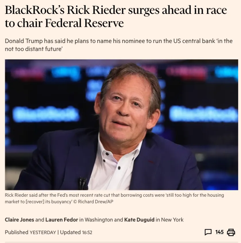 <블랙록의 릭 라이더(Rick Rieder), 연준(Fed) 의장 지명 경쟁에서 급부상> 도널드 트럼프는 "머지않은 미래에" 미국 중앙은행 의장 지명자를 발표하겠다고 밝혔다. 릭 라이더는 연준이 최근 금리를 인하한 이후에도 주택 시장 회복에는 차입 비용이 '여전히 너무 높다'고 말했다.