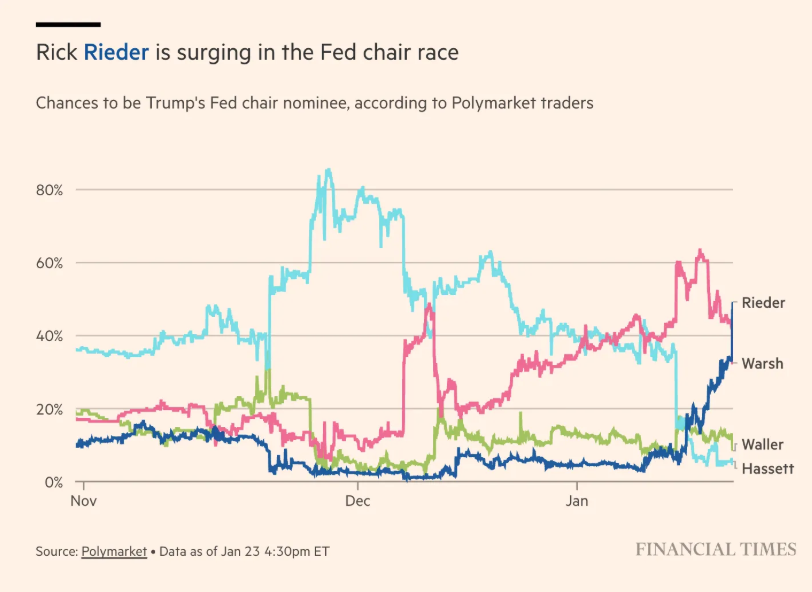 <릭 라이더, 연준 의장 경쟁에서 급상승 중> 폴리마켓(Polymarket) 거래자들이 예측한 트럼프의 연준 의장 지명 가능성