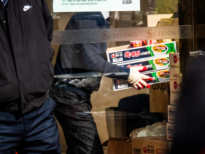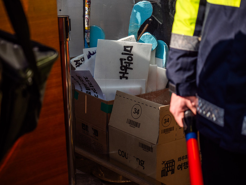 세종호텔 관계자가 시민들의 연대 물품이 있던 농성장을 철거하고 있다. 참세상 박도형 기자.