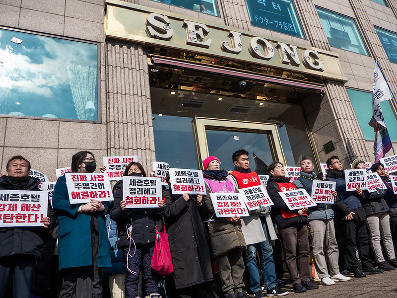 이날 오전 경찰은 해고자들의 복직과 실소유주 주명건의 교섭 참여 등을 요구하던 로비 농성장을 침탈하고, 민주노총 서비스연맹관광레저산업노조 세종호텔지부 조합원들과 연대 시민 십여 명을 강제 연행한 바 있다.