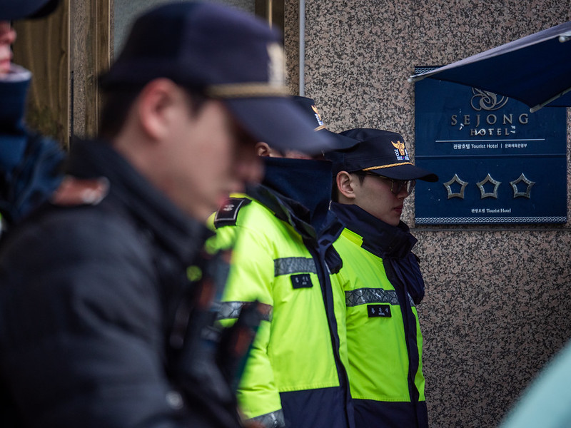 경찰이 지키는 세종호텔 정문 옆, 식음료사업을 제공해야 받을 수 있는 등급인 3성급을 나타내는 표지가 붙어 있다. 참세상 박도형 기자.