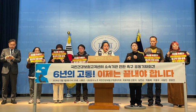 국민건강보험 고객센터 상담노동자들의 정규직 전환 문제가 정부 정책으로 공식화된 지 6년이 지났지만현장에서는 여전히 용역·위탁 구조가 유지되고 있다노동자들은 사회적 합의가 이행되지 않은 채 지연만 반복되는 구조 자체가 공공부문 사용자 책임의 실종을 보여준다고 지적했다.