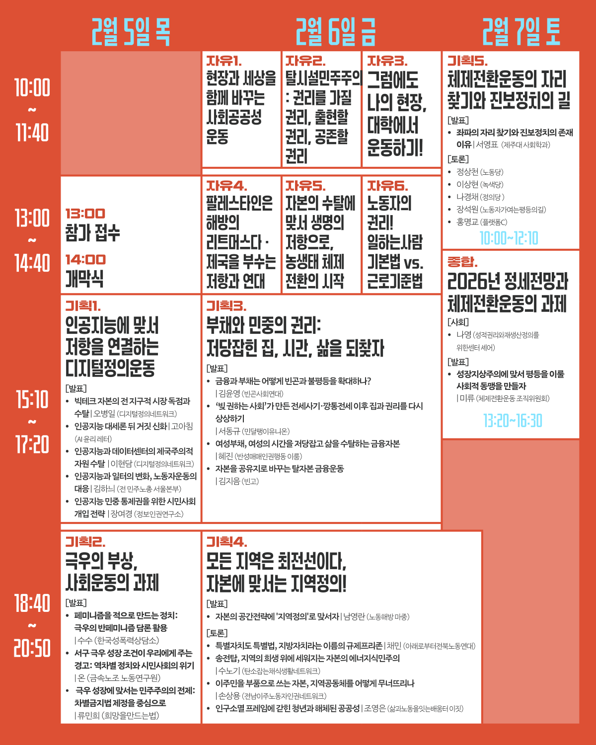 8일 마지막 날 종합세션은 “2026년 정세전망과 체제전환운동의 과제”를 주제로 성장지상주의에 맞서 평등을 이룰 사회적 동맹을 만들기 위한 토론이 진행될 예정이다.