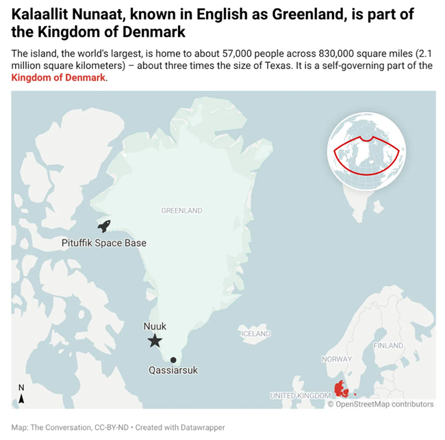 이 섬은 세계에서 가장 큰 섬으로약 83만 제곱마일(210만 제곱킬로미터)에 걸쳐 약 5만 7천 명이 살고 있다이는 텍사스주의 약 세 배 크기다그린란드는 덴마크 왕국의 자치 지역이다.