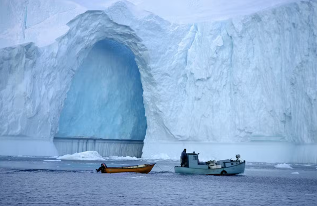 2008년 그린란드 일룰리사트(Ilulissat) 인근에서현지 주민들이 얼음 동굴이 있는 빙산 옆에서 작은 배를 타고 낚시를 하고 있다. (피어리–맥밀런 북극박물관 소장보도인 칼리지 브라이언 알렉산더 제공)