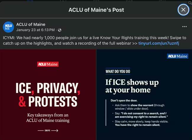 메인주 미국시민자유연맹(ACLU of Maine)의 페이스북 게시물은 2026년 1월 23일 열린 ‘권리 알기(Know Your Rights)’ 교육 행사에 많은 사람이 참석했음을 전했다.