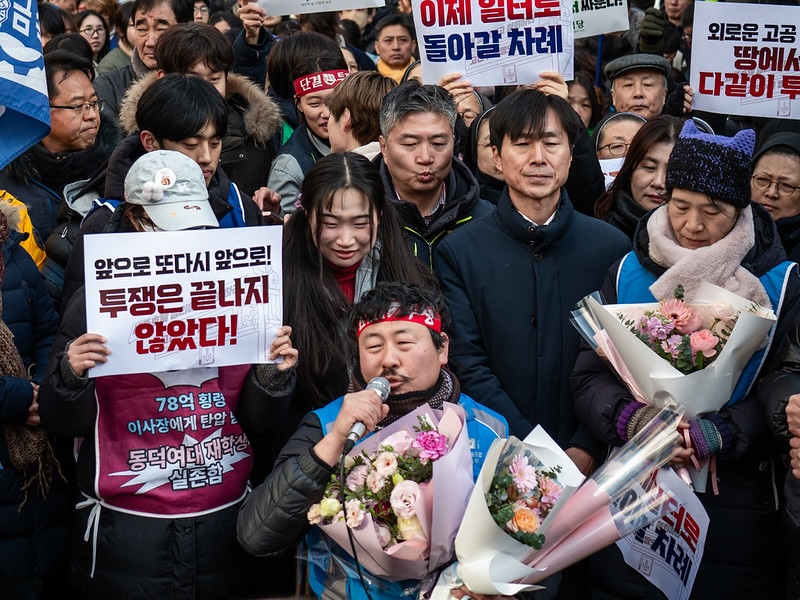 고진수 세종호텔 해고 노동자가 336일 만에 고공에서 내려와 땅을 밟고 직접 교섭에 참여했다. 7차 교섭에도 세종호텔 사측은 복직 요구를 거부하며 위로금만 제시하고 있다. 해고 노동자들과 연대 시민들은 “진짜 사장 주명건”의 교섭 참여 등을 요구하며 호텔 로비에서 농성에 돌입했다.