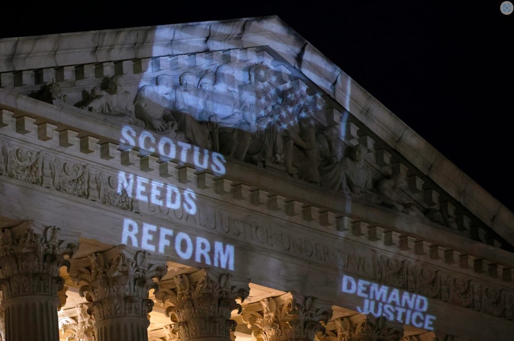 미국 대법원 판사 사무엘 알리토는 Dobbs 대 Jackson Women’s Health Organization 사건(낙태 규제 강화 계기가 된 판결)의 다수 의견을 작성한 후 최근 극우 성향의 노력과 원인을 지지하는 깃발이 그의 거주지 밖에 게양된 것으로 논란이 되었다. 워싱턴 D.C.의 시위자들은 2024년 5월 21일 대법원 건물에 그 깃발 중 하나의 이미지를 "대법원 개혁이 필요하다(SCOTUS NEEDS REFORM)"라는 문구와 함께 투사했다. PHOTO BY PAUL MORIGI/GETTY IMAGES FOR DEMAND JUSTICE