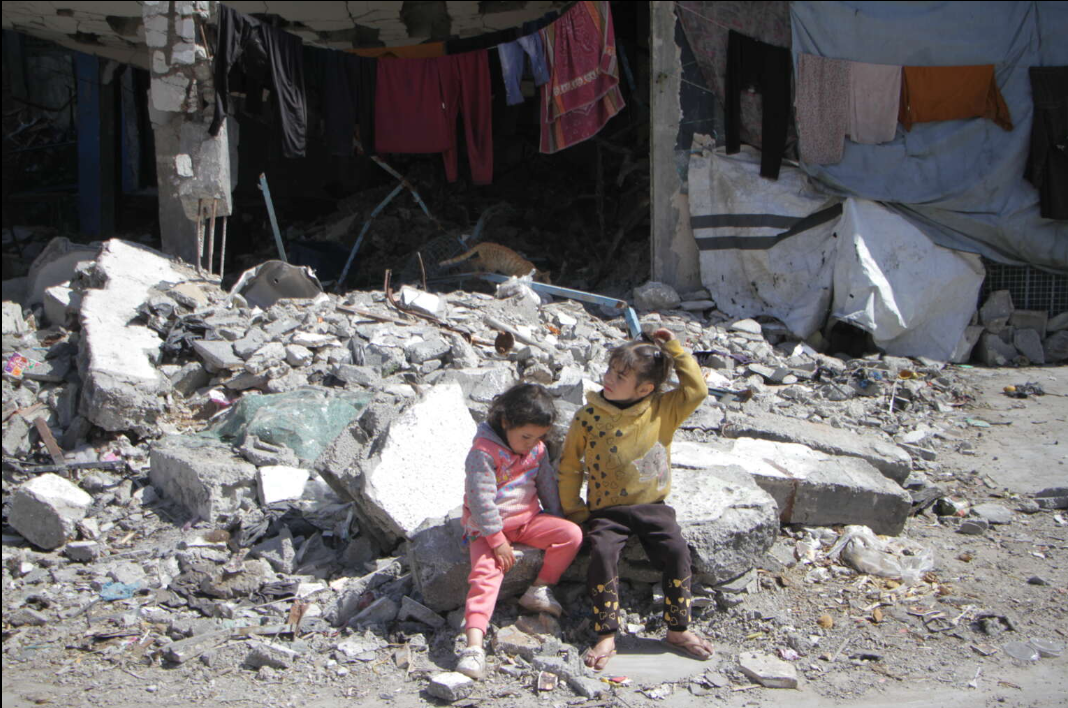 2024년 3월 4일, 팔레스타인 어린이들이 가자지구의 유엔 학교 잔해에 앉아 피난처를 마련하고 있다. 출처 : 마흐무드 이사, 아나돌루 게티 이미지