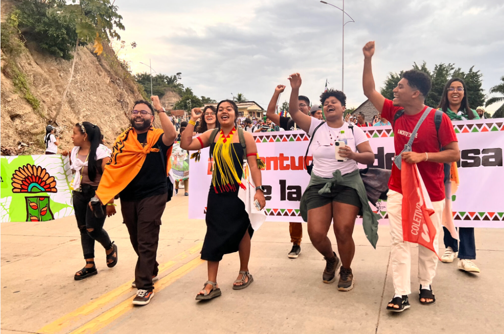 6월 12일 볼리비아 루레나바케에서 열린 범아마존 소셜 포럼에서 아마존 지역사회의 젊은이들이 행진하고 있다. 출처 : 케이티 수르마/인사이드 클라이밋 뉴스