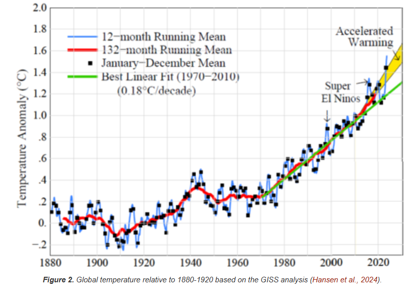 GISS 분석에 근거한 1880-1920년 대비 지구 온도. 출처 : Hansen et al., 2024