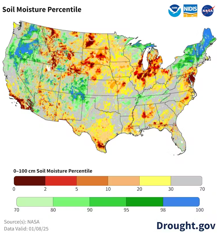2025년 1월 8일, 로스앤젤레스 주변 지역에서 약 40인치(100cm)까지 측정된 토양 수분 함량은 그날 역사적으로 하위 2%에 속했다. NASA