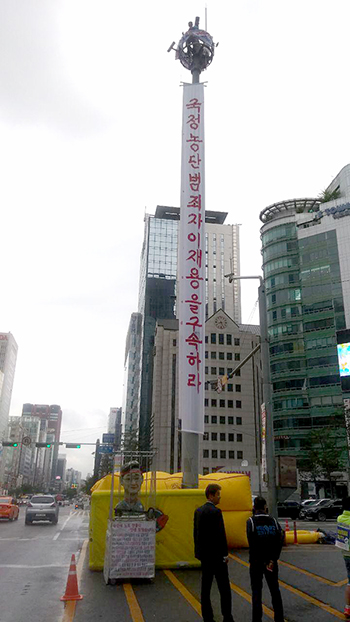 삼성 해고자 김희용 씨가 10일 오전 5시경 삼성 서초사옥 앞 고공농성에 돌입했다. 김 씨는 삼성 해고자 3명(삼성그룹해고자복직투쟁위원회 소속)...
