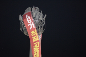 LG유플러스 비정규직 노동자 2명이 12일 오전 한강대교 북단 인근 40m 철탑 고공농성에 돌입했다. 이들은 철탑 꼭대기에서 ‘비정규직 끝장내자...