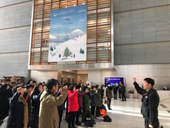공공운수노조 서울지부 산업은행분회(분회장 남용진) 조합원 100여 명은 6일 오후 3시 서울 여의도 산업은행 본점 로비를 점거했다. 청원경찰과 ...