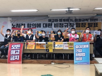 민주노총 중앙집행위원회 회의가 공전하는 동안 비정규직 당사자들은 기자회견을 열고 노사정대표자회의 합의안은 해고와 생계위기에 처한 비정규직을 외면...