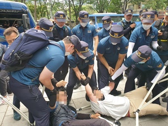 지난 19일 설치한 아시아나 하청노동자들의 천막이 세 번째 강제철거됐다. 23일 오후 4시경 경찰 및 종로구청 용역 100여 명은 금호아시아나 ...