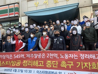 공공운수노조 이스타항공조종사노조는 오전 10시 30분 이스타항공 서울 본사 앞에서 기자회견을 열고 “이스타항공 경영진은 부당한 희망퇴직과 정리해...