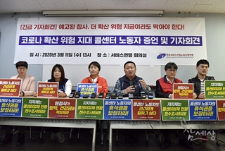 민주노총 서비스연맹 서비스일반노조 콜센터지부는 11일 오후 1시 기자회견을 열고 “이번 코로나19 사태가 아니더라도 독감, 눈병 등 전염성이 강...
