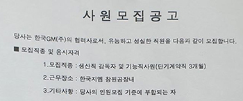 지엠 창원, 비정규직 585명에 “외부인이 업무방해”