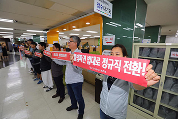 고용노동부가 기아자동차 불법파견 문제를 두고 ‘반쪽짜리’ 시정명령을 내리자, 이에 반발한 비정규직 노동자들이 1일 서울고용노동청 점거 농성에 돌...