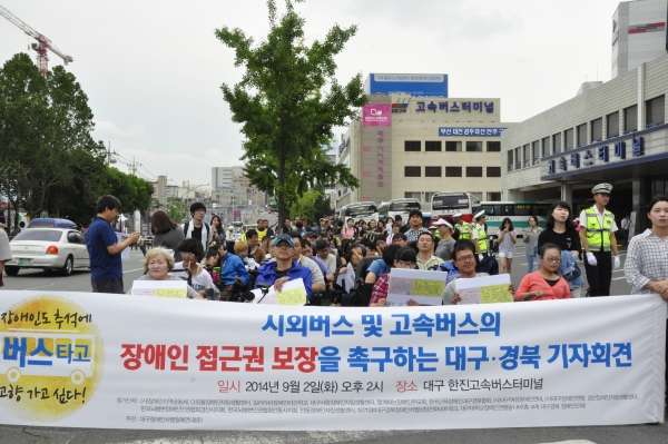 울산장애인철폐연대는 2일 오후 고속버스 터미널 앞에서 회견을 열어 고속버스와 시외버스에 장애인 접근권을 보장하라고 요구했다.