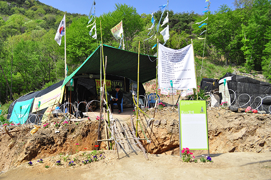 부북면 평밭마을 127번 움막을 지키는 윤여림(75) 씨는 매일 새벽 3시 30분이면 2시간 동안 절을 한다. 그는 “레미콘 차를 혼자 막으니까...