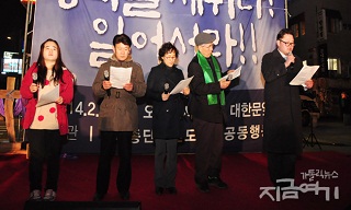 천주교, 개신교, 불교, 원불교, 천도교 등 5대 종단 평신도들이 연합시국기도회를 열고 “불법 대선 신상규명, 이명박 수사와 처벌, 박근혜 대통...