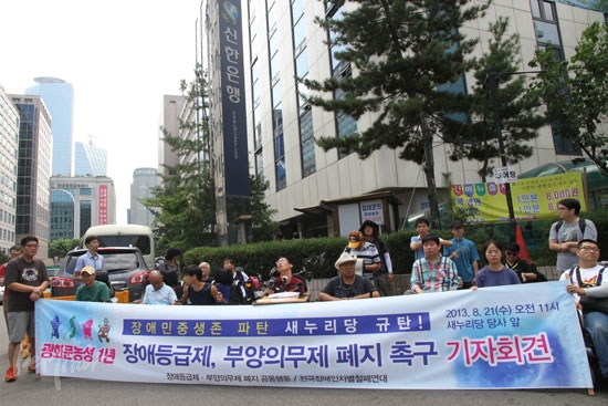 장애등급제·부양의무제 폐지 광화문 농성 1주년을 맞아 새누리당에 장애등급제·부양의무제 폐지를 촉구하는 기자회견이 전국에서 동시다발로 이어졌다.