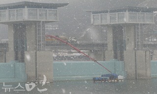 4대강 사업이 총체적 부실사업이라는 감사원의 발표 후 국토해양부가 겨울임에도 불구하고 낙동강 낙단보(경북 상주)에 콘크리트 타설 보강공사를 진행...