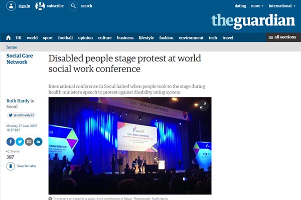 전 세계적으로 영향력있는 영국 일간지 가디언(the Guardian)이 세계사회복지대회 개회식에서 벌어진 장애등급제 비판 기습시위를 다뤘다.