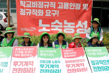 비정규직 노동자들은 5일 기자회견을 열고 “문재인 대통령이 ‘공공부문 비정규직 제로시대’를 열겠다고 약속했지만, 일자리위원회는 대책을 발표하고 ...