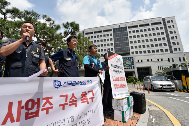 금속노조 갑을오토텍지회가 대전지방고용노동청 천안지청장 안모 씨와 충남 아산경찰서장 윤모 씨, 일부 경찰관들은 형법상 직무유기로 2일 경찰에
