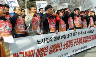 노동시장 구조개편을 위한 경제사회발전노사정위원회(노사정위) 논의 시한인 31일. 노사정위가 위치한 서울 광화문 정부종합청사 앞은 노사정 야합을 ...