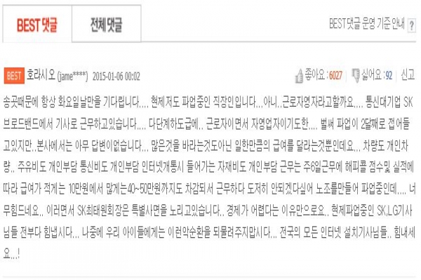 파업 중인 SK브로드밴드 비정규직 노동자가 네이버 웹툰 <송곳>에 남긴 댓글이 화제다. 닉네임 ‘호라시오’는 자신을 “통신 대기업 S...