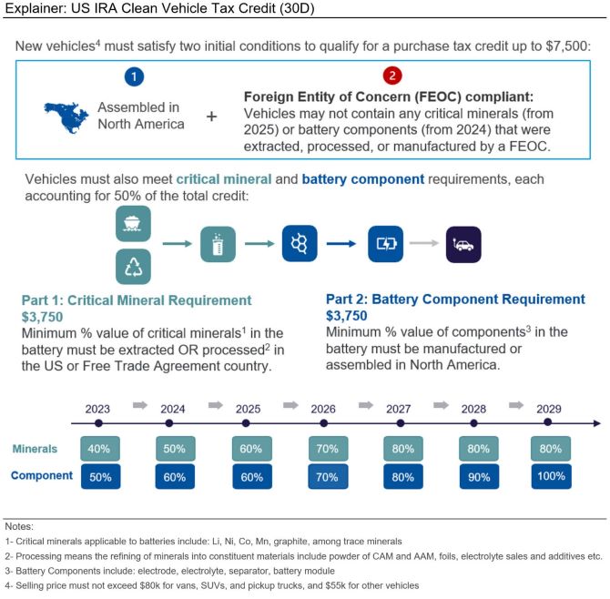 이달 초 재무부의 최종 '우려 대상 해외 기업' 지정이 발표되었다. 이는 배터리 부품과 주요 광물에 대한 미국의 중국 의존도를 줄이기 위한 것이다. 자동차 제조업체는 배터리 공급망에 속한 회사 중 중국 정부 관련 회사가 지분, 의결권 또는 이사회 지분의 25% 이상을 소유하고 있는 경우 인플레이션 감축법 세금 공제를 받을 수 없게 된다.