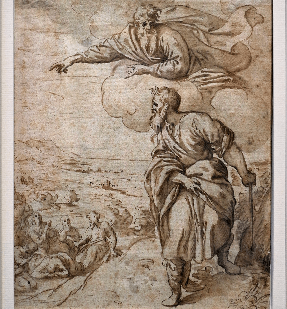 모세에게 약속의 땅을 보여 주는 이스라엘의 하나님을 묘사한 장로 프란스 푸르부스(1565~80경)의 상상 그림. 출처: Sailko – CC BY 3.0