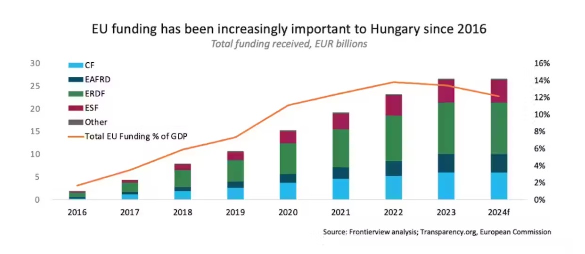 지난 3년 동안 EU는 헝가리 정부의 사법 및 언론 독립에 대한 공격, 동성애 혐오 및 인종 차별 정책, 행정부 구성원들의 만연한 부정부패로 인해 약 300억 유로의 자금을 동결했다.