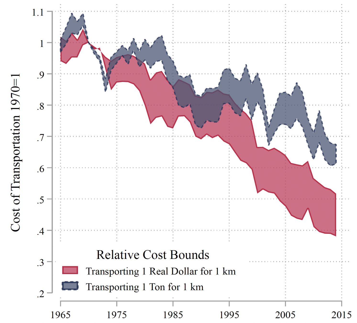 그림 2는 특정 연도의 모든 글로벌 운송 비용의 합계를 해당 연도의 무역 사용량(무역 톤수 또는 무역 가치)으로 나눈 값에 거리를 곱하여 계산한 것이다. 운송 비용의 경우 운송 및 보관 지출에 대한 데이터를 사용한다. 상한 추정치는 모든 총 운송 지출이 국제 무역에 대한 지출이라는 시나리오를 기반으로 하며, 하한 추정치는 국제 및 국내 무역 모두에 대한 지출을 반영한다. 값은 1970년 1로 정규화되었다. 전 세계 GDP의 90%를 차지하는 24개국의 일관된 표본이다. 출처: 가나파티와 웡(2024)