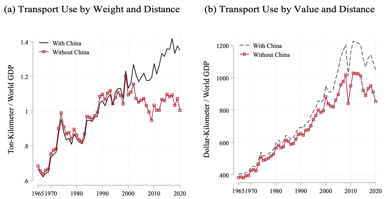 개발도상국은 중국이 주도하는 세계 수출의 약 40%를 차지한다(UNCTAD 2022). 중국을 제외한 통계를 다시 계산해 보면 1990년 이후의 모든 중량 기준 운송량 증가는 중국의 부상을 반영하는 것으로 나타났다(그림 3a). 그러나 중국은 가치 기반 무역 측정에서 보다 적당한 역할을 하고 있다(그림 3b). 그러나 이러한 고가 및 저중량 상품은 근접성-집중도 트레이드오프에 변화를 겪을 수 있다. 원자재 수입 비용이 저렴해지면서 생산 위치는 최종 수요의 위치를 반영하게 된다.