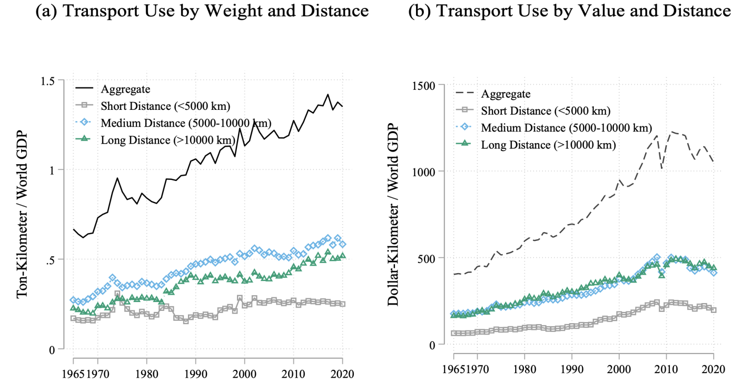 1965년부터 2020년까지 전 세계 운송량은 급격히 증가했으며, 더 많은 상품이 더 멀리 운송되고 있다. 운송 서비스는 운송되는 상품의 양과 운송되는 거리라는 두 가지 요소로 구성된다. 운송 사용량은 중량(톤-킬로미터)으로 측정하거나, 금액(달러-킬로미터)으로 측정할 수 있다. 중량 기반 측정은 곡물이나 석유 제품처럼 중량당 가치가 낮은 상품을 반영하는 반면, 가치 기반 측정은 기계나 전자제품처럼 중량당 가치가 높은 상품을 강조한다. 이 두 가지를 모두 거리에 곱하면 수출과 수입을 합산하는 기존 무역 지표에서 누락된 운송 사용량을 측정할 수 있다.