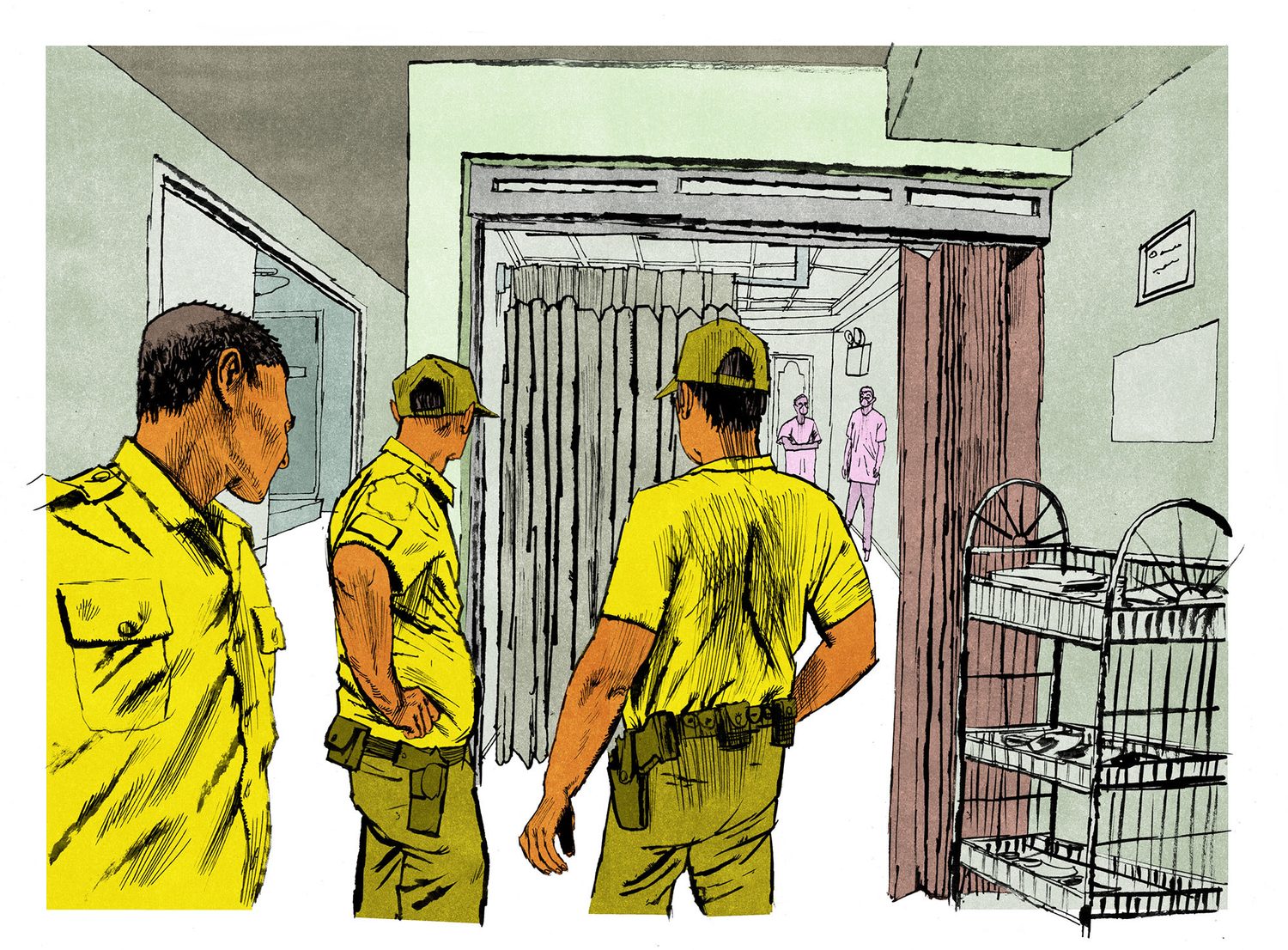 브랜든 리가 바기오 종합병원에서 약 한 달 동안 회복하는 동안 여러 명의 경찰이 입구에 서 있었다. 불안한 마음에 리의 가족과 친구들은 24시간 병상 옆을 지켰다. 출처 : Matt Rota