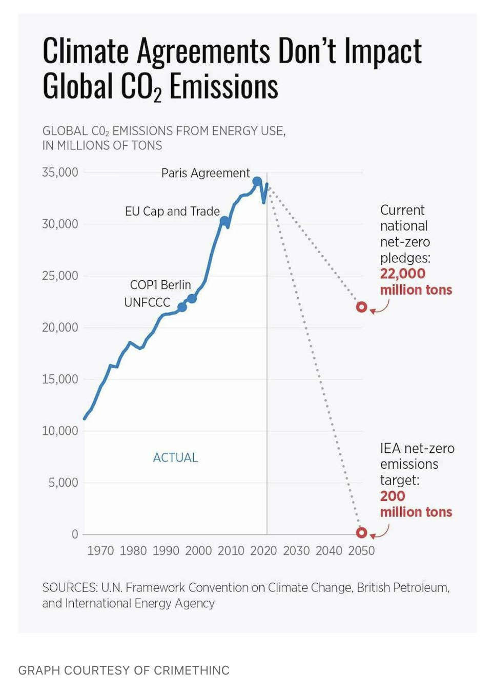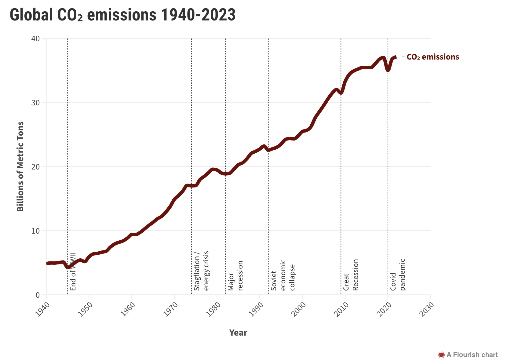 개별 국가들이 회계상의 속임수로 만들어낸 배출 감소에도 불구하고, 우리는 엄혹한 현실에 직면하고 있다. 전 세계적으로 탄소 배출량은 1950년 이후 거의 600% 증가했다. "녹색" 에너지와는 무관하게 매년 배출량이 증가하고 있으며, 배출량이 감소한 몇 안 되는 해에는 자본주의에 큰 위기가 닥쳐 경제 활동이 정체되거나 감소했을 때뿐이다. 이러한 예로는 1945년(전시 생산의 종료), 1974년(미국의 전쟁 적자와 1973년 에너지 위기로 인한 스태그플레이션), 1980-1982년(제2차 세계대전 이후 최대의 불황), 1992년(탈소련 국가들에서의 경제 붕괴), 2009년(세계 금융 위기), 2020년(코로나19 팬데믹의 시작) 등이 있다.