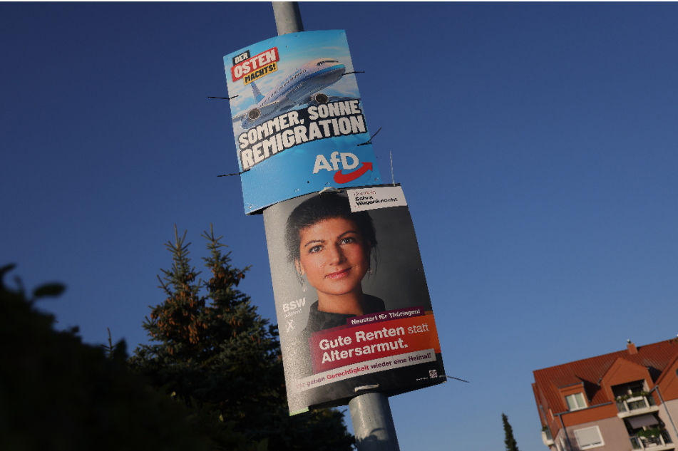 독일을 위한 대안(AfD)의 선거 캠페인 광고 문구: 이민자 대량 추방과 관련하여 "여름, 태양, 이주". 자라 바겐크네히트 동맹(BSW)의 선거 캠페인 광고 문구: "노년 빈곤 대신 좋은 연금". 2024년 8월 27일 독일 예나 인근 가로등. 출처: 션 갤럽/게티 이미지