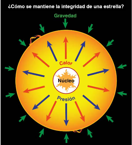 "별의 구조적 완전성은 어떻게 유지되는가?" 주계열에서는 별 자체의 중력(별을 압축하는 경향)이 복사 압력으로 보정된다. 출처: 원문 이미지