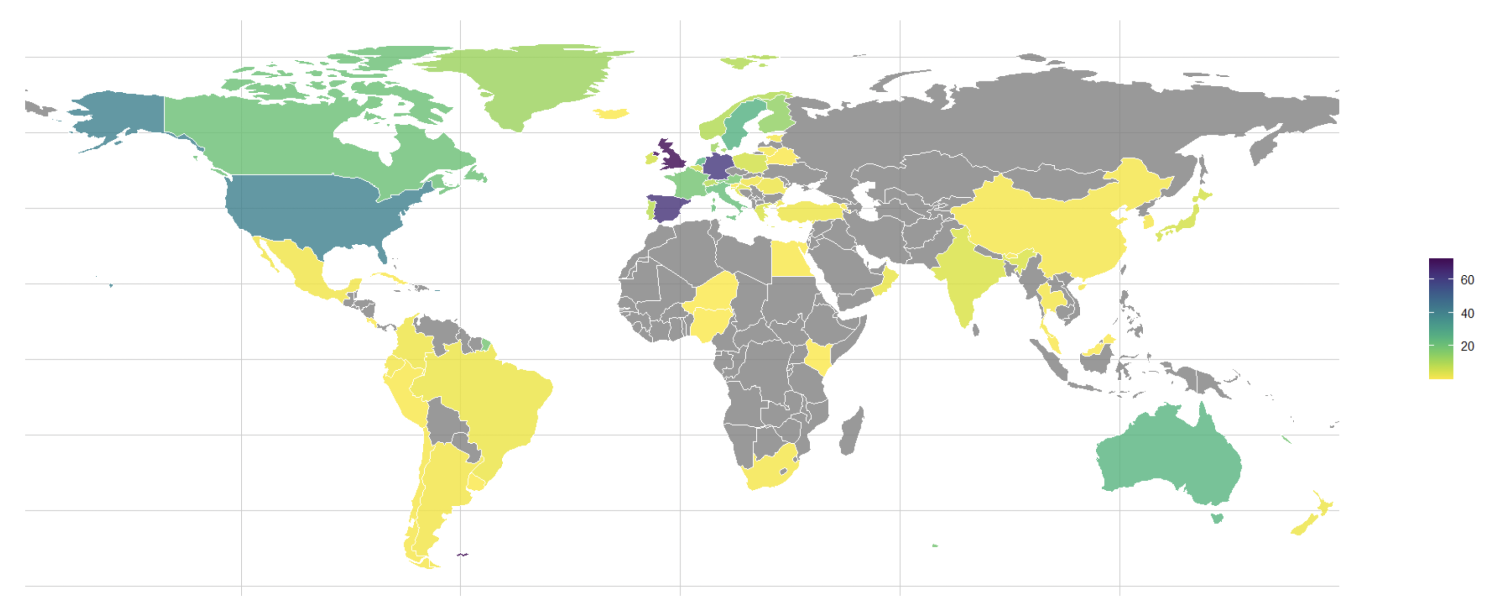 샘플에 포함된 대부분의 저자는 서유럽과 미국의 기관에 소속되어 있으며(그림 2), 영국, 스페인, 독일이 큰 차이로 선두를 달리고 있다. 이는 남반구에서 탈성장에 대한 지지가 거의 없다는 이전 연구 결과와 일치한다(King et al. 2023).